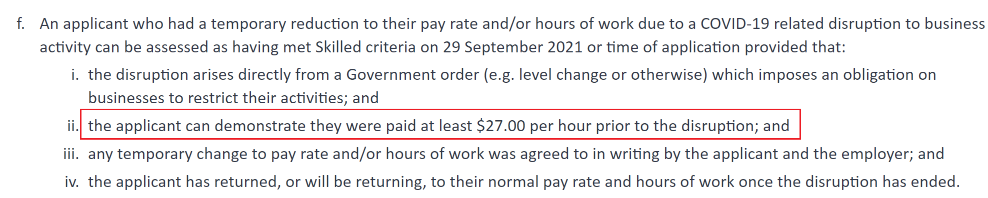 Normally, under Skilled, you need to show you were paid $27/hour on 29/09/2021 in a full time role. But if you were on wage subsidy on that date, you will need to show you were paid $27/hour before the period of the period of disruption had started.
