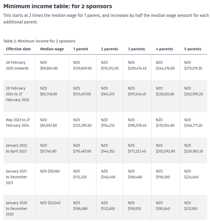 From 28 February 2025, income thresholds for sponsors under the Parent Category were indexed to the new median wage of NZD $33.56 an hour.